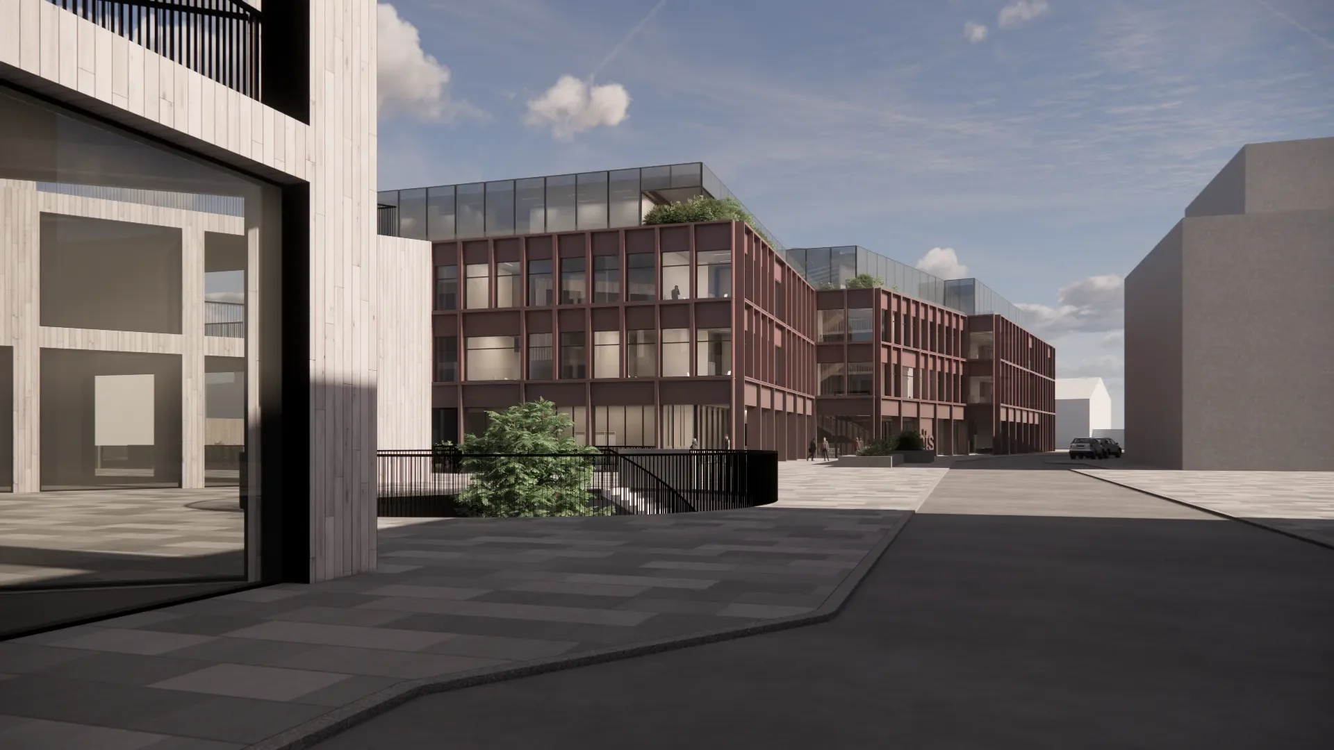 Djúptæknisetur við Bjargargötu 3 í Vatnsmýrinni, séð frá Grósku. Myndin er úr frumdrögum að hönnun byggingarinnar og er unnin af PLAN Studio.