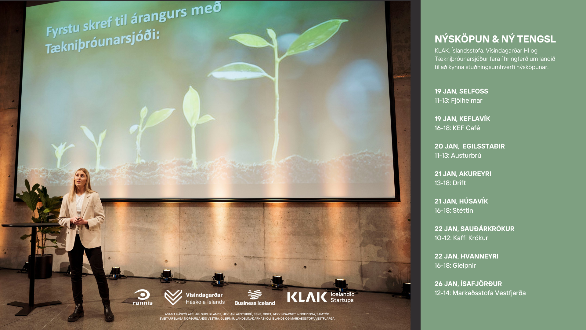 Vísindagarðar, KLAK - Icelandic Startups, Íslandsstofa og Tækniþróunarsjóður heimsækja landsbyggðina og halda opna kynningarfundi fyrir frumkvöðla, sprota og fyrirtæki sem eru að þróa lausnir framtíðarinnar og vilja vaxa og sækja á nýja markaði.